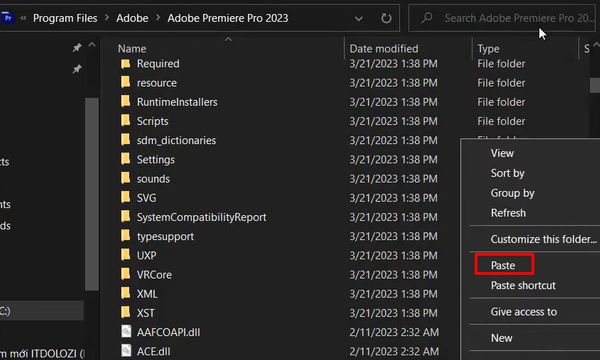 Bước 7: Mở thư mục phần mềm Premiere 2023 → paste 3 thư mục vừa copy vào.